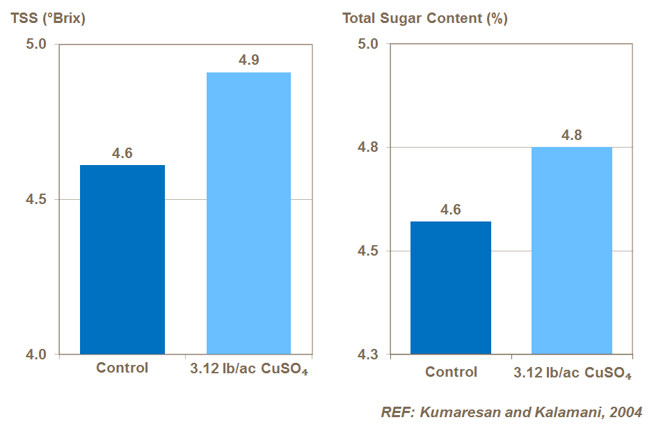 Bakır sülfatın yetersiz topraklara bazal uygulamaları, Hindistan'daki denemede gösterildiği gibi, bitki büyümesini ve bunun sonucunda verimi arttırır.